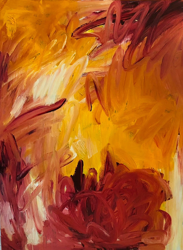 En esta pintura, capas de amarillo fundido y rojos viscerales colisionan en un estallido de movimiento emocional. La pincelada es descarada —gruesa, circular y cargada de tensión—, transmitiendo la fuerza que no proviene de la certeza, sino de la decisión de seguir adelante a pesar del miedo. Hay un calor en el lienzo, un pulso inquieto que habla de resistencia interior, transformación y liberación.